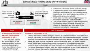 - Littlewoods contended the photos were exclusively used to drive retail sales (taxable), entitling them to full VAT recovery.