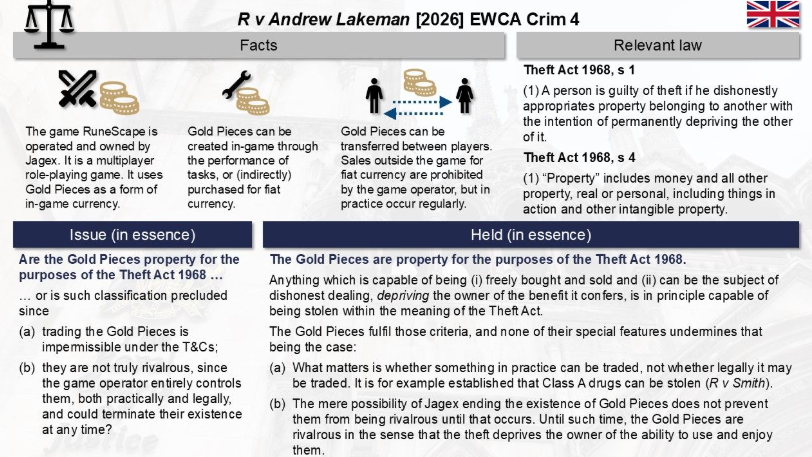 In a judgment delivered on 14 January 2026, the Court of Appeal (Popplewell LJ, Soole J and Mayo HHJ) allowed the prosecution’s appeal, holding that RuneScape gold pieces are “property” capable of being stolen. [iclr.co.uk]