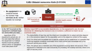 - Oblastní nemocnice Kolín, a hospital, provides both VAT-exempt health services (requiring minimum equipment for licensing) and VAT-deductible services, leading to a dispute over VAT deduction on equipment purchases.